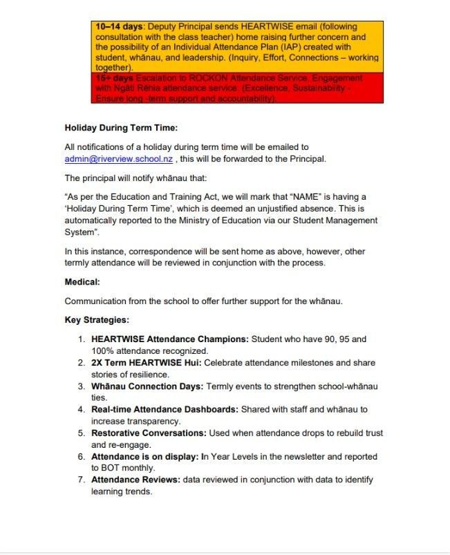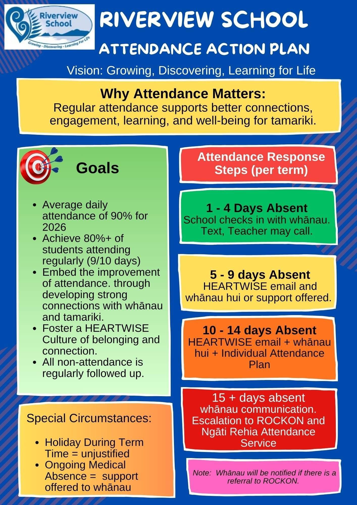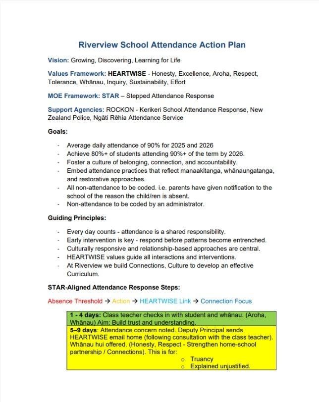 Our approach is grounded in making strong connections with tamariki, whānau and wider supports. We understand that there can be complex reasons affecting attendance, and we are committed to working alongside families to support every learner to attend, engage and thrive.